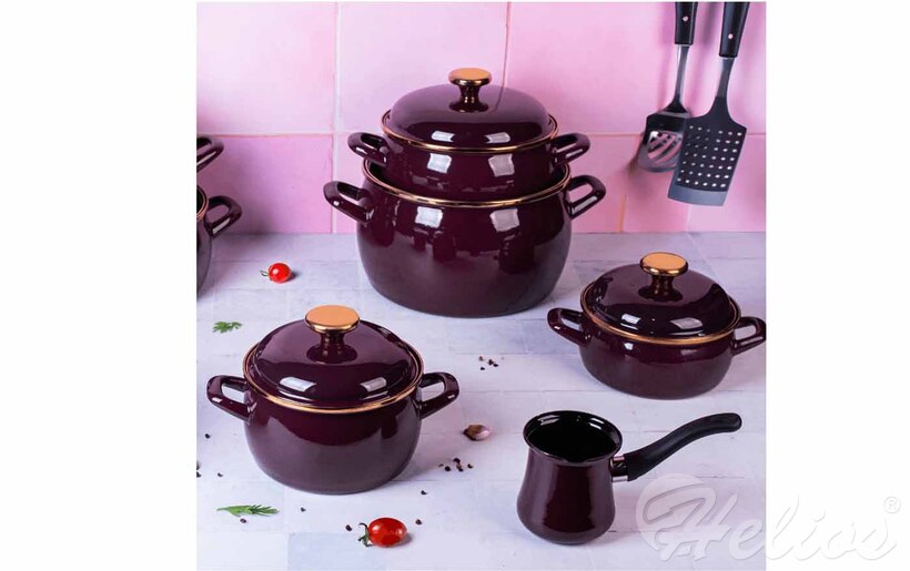 Elegancki i ponadczasowy garnek z kolekcji Bordeaux który wyróżnia się głębokim bordowym kolorem oraz subtelnym złotym wykończeniem, nadającym mu wyjątkowego charakteru. Ten niski garnek doskonale wpisuje się w nowoczesne, jak i klasyczne wnętrza, będąc zarówno ozdobą kuchni, jak i funkcjonalnym narzędziem do codziennego gotowania.