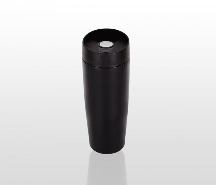 Kubek termiczny o pojemności 350 ml wykonany ze stali nierdzewnej, lakierowanej na kolor czarny. Posiada podwójne ścianki zapewniające dłuższe utrzymywanie temperatury niż zwykłe kubki. Kubek wyposażony jest w stalowy wkład termiczny oraz nakręcaną przykrywkę ze szczelnym, przyciskanym zaworkiem upustowym, zabezpieczającym przed wyciekiem zawartości. Kubek wykonany solidnie ze stali nierdzewnej, tworzywa oraz uszczelek gumowych, dostosowany jest do uchwytów o średnicy 70 mm, znakomicie sprawdza się podczas podróży autem. Kształt kubka sprawia, że znakomicie trzyma się w dłoni. Zewnętrzne ścianki kubka nie nagrzewają się po zalaniu wrzątkiem. Gruba przykrywana z uszczelkami oraz zaworkiem niekapkiem oraz gumowa podkładka przy podstawie zwiększają właściwości termiczne. Kubka można używać nie tylko do napojów gorących ale również do zimnych napojów orzeźwiających z lodem. ...